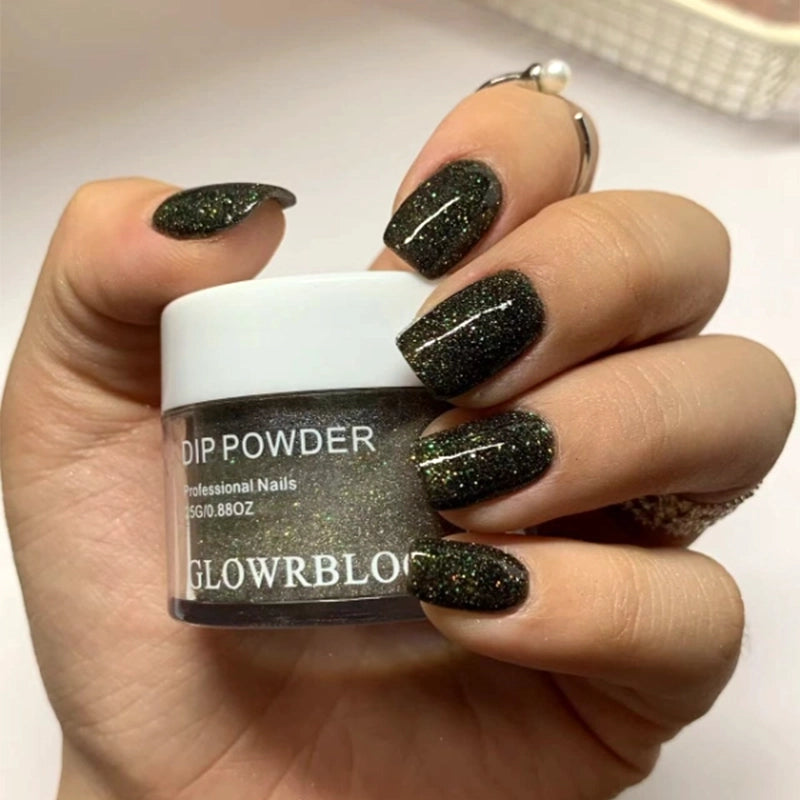 Deep olive shimmer dip powder with a luxe finish